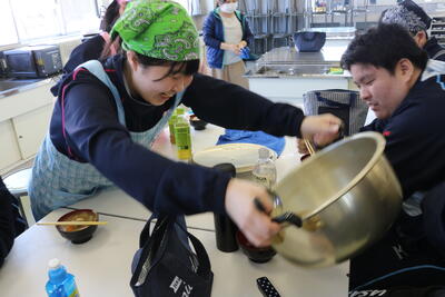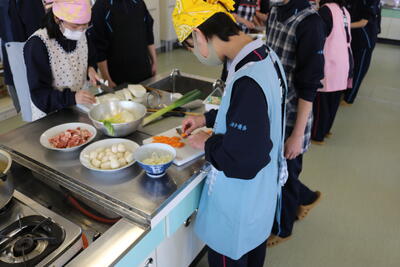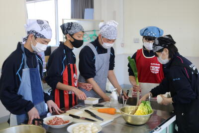 当初の計画では4月15日(木)~16日(金)に1年生が1泊2日で予定していたHR合宿が新型コロナのまん延防止等重点措置期間であること等を考慮して、この期間に実施できなくなったため、4月15日(木)学校内で代替行事を持ちました。人間関係作りの活動を始める前に、新入生全員が各自「中学校時代に一番楽しかったこと」と「高校生活で期待すること」を用紙に書きました。高校生活への期待として「友人と仲良く楽しい学校生活を送りたい」との内容が共通しており皆が願っていることでした。その後の人間関係作りの活動には皆積極的に参加しとても楽しんでいました。その後、豚汁を作り同じ釜の飯を皆で味わいました。1年生の新クラスが団結する貴重な時間となりました。
