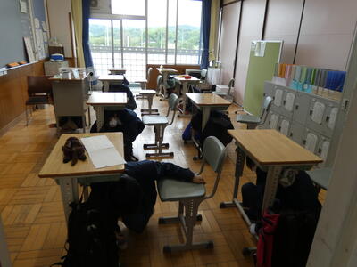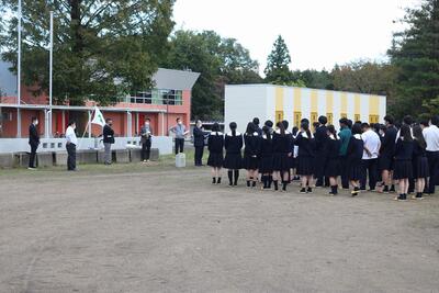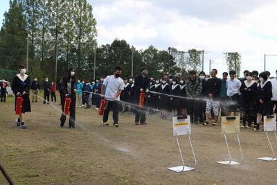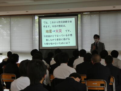 5月に実施された第1回防災訓練に続き、10月28日(木)、同じ校舎を共有している柴田農林高校川崎校と岩沼高等学園川崎キャンパスの生徒・教職員が共に第2回防災訓練を実施しました。「訓練!訓練!緊急地震速報です。慌てずに身を守りなさい。」「揺れが収まりました。安全点検中です。次の指示を待ちなさい。」「進路室から火災が発生しました。東階段を使って落ち着いて避難しなさい。」の放送が入る。地震発生から火災発生による避難訓練である。