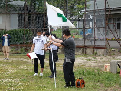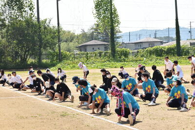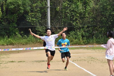 ⑥台風の目「異常気象を吹っ飛ばせ」(長い棒を3人で持ちながら指定されたコースを走りリレー形式で行うもの)では、コーンを旋回して戻ってくる姿が台風の目のようでした。⑦クラス対抗リレー「イエーイ!空前絶後のクラス対抗リレー!!」では、各学年が本気を出して走ったからこそ大変に盛り上がりました。