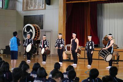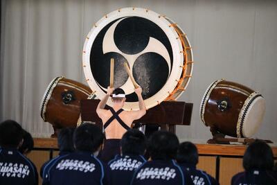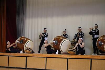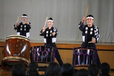 朝9時過ぎにはオレンジ色の大型トラックが校門から入場、太鼓等を積んできたことに気づく。その後、バスで舞台メンバーやスタッフの皆さんが到着。午後の本番に向けて入念なリハーサルが開始され、太鼓や笛の音色が体育館から漏れ聞こえてきた。10月23日(土)に実施予定の川高祭で披露する学年縦割りグループの「ヨサコイ、和太鼓、装飾」のメンバーも既に決まっている。特に和太鼓を希望した生徒たちにとっては、太鼓のプロ集団「鼓童」のパフォーマンスは興味津々だ。本物の「音、姿、魂」を体感することで、私たちひとり一人が、生きるエネルギーを充電する良い機会となった。演技終了後には川高祭和太鼓リーダーが代表あいさつ(御礼)を行った。【文責 副校長・下田 仁】