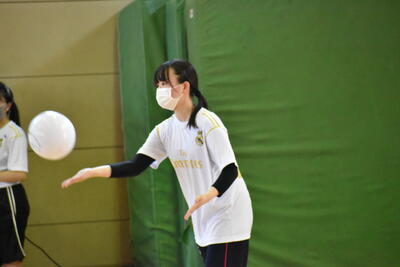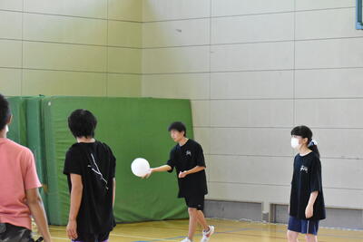 ③「ビニールバレー」・・・運動が苦手な生徒を含めて全員が楽しめるように、ビニールボールを使用した1チーム4人のバレーボールを行いました。チーム4人のため、ゲームに向き合うチャンスが必然的に多くなり、普段消極的な人も積極的にならざるを得ない貴重な場面となりました。