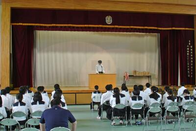 体育館ステージ側には生徒会役員、委員会委員長、部活動部長などの代表生徒が座し、各学年の生徒が取り囲むようにしている。 前期活動報告等に加え、生徒会会長選挙開票結果報告、新生徒会役員人事、クラスからの提案・要望事項などが出された。皆、関係資料を見ながら説明等に真剣に耳を傾けていた。最後に、前生徒会長から新生徒会長にバトンタッチされ、旧役員全員からの一言のあと、新役員全員からの抱負が披瀝された。新生徒会役員には、旧役員の取組成果を受け継ぎ、更なる飛躍を目指して頑張っていただきたい。【文責:副校長 下田 仁】