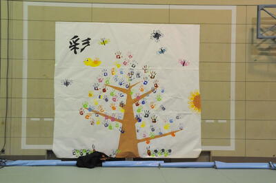 ここでは,以下にパンフレットに記載された副校長と川高祭実行委員長のあいさつと,川高祭・縦割りグループ(和太鼓・よさこい・校内装飾)と全校制作作品の写真を掲載します。全校制作は,生徒全員の手形による装飾画で,川高祭のテーマを表現したものです。