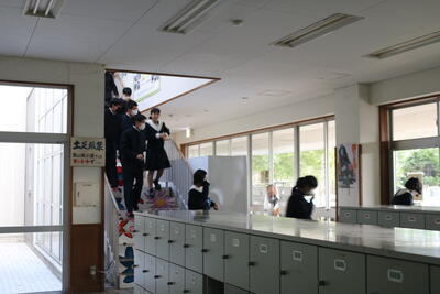 「和太鼓」と「よさこい」の練習は,3年生を中心に先輩が後輩を指導しながら共に作り上げていく「生徒主体の練習・披露」が代々引き継がれている伝統行事です。また,「校内装飾」では,秋の花々をモチーフに作成された装飾絵画が,(1~2階)東西階段の側面に色とりどりの花々として咲いています。そして,正面玄関前には1年生による力作「川高祭立て看板」が皆さんを歓迎しています。