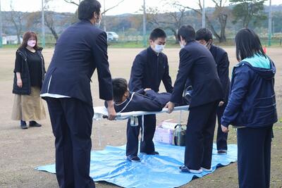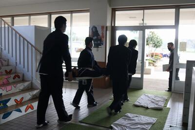 ② 生徒に負傷者が出たことを想定したこと。腕や膝への負傷者3人、担架係4人、応急手当係4人を予め決めて実施した。負傷者への級友へ対応する光景を見て、全校生徒にその意識を持ってもらうねらいもある。