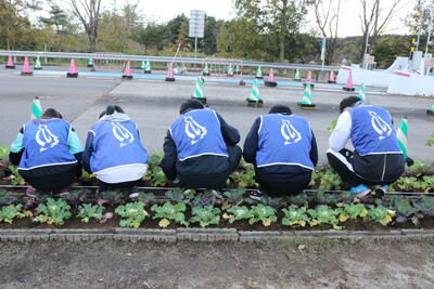 川崎IC入口に向かって右側にある花壇に、NEXCO東日本の方々に用意していただいた葉牡丹を交互に植えていきました。葉牡丹はキャベツのように見えますが葉が色づくため、花の少ない冬期に花壇を彩ってくれる冬のガーデニングに欠かせない存在です。また、祝福・利益・慈愛などの花言葉をもつ縁起のよい植物として、お正月の寄せ植えに昔から利用されてきたようです。