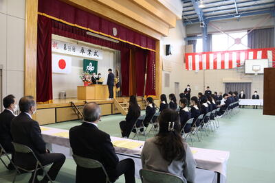 卒業証書が卒業生ひとり一人に授与され、その後、3年間皆勤賞、ボランティア功労賞の賞状及び記念品が関係の卒業生に授与されました。学校長式辞の後、川崎町の小山町長からご祝辞をいただき、卒業生の前途への励ましとなるお言葉を頂戴しました。来賓紹介・祝電披露の後、在校生代表(現生徒会長)から送辞、卒業生代表(前生徒会長)から答辞がありました。送辞では先輩方から様々な場面で支えていただいたとの感謝の気持ちと今後の卒業生の活躍への期待が述べられ、答辞では入学時からの3年間を振り返り、成長の実感と感謝の気持ちが素直な気持ちで述べられました。卒業生保護者代表からは、深い感謝の気持ちが伝わってくる非常に丁寧で心温まる謝辞をいただき、教職員一同、自然と頭が下がりました。そして、校歌演奏、閉式。厳粛で立派な卒業式を迎えることができました。関係の皆様、大変にありがとうございました。
