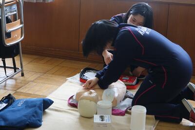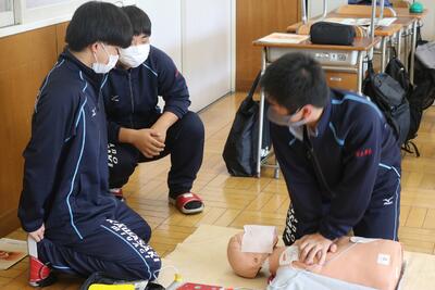 令和4年8月1日(月)に,大河原消防署川崎出張所から職員の方を招いて,3年生を対象とした救急救命講習が行われました。この講習では,訓練用の人形を用いて一人ひとりが救命訓練に挑戦しました。訓練では実際にAEDを使用し,心臓マッサージなどを行いました。きっと緊急時に役立つことと思います。