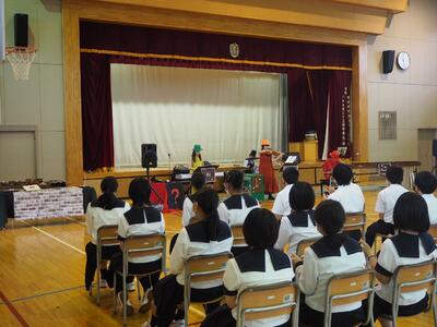 令和4年8月25日(木)に芸術鑑賞会がありました。今年のジャンルは音楽で,生徒たちが鑑賞しているフロアに演奏家の皆さんがいて,ピアノ,バイオリン,二胡,ドラムで演奏を奏でました。曲目は映画音楽のザ・ローズやテレビでおなじみの情熱大陸などでとても迫力がありました。