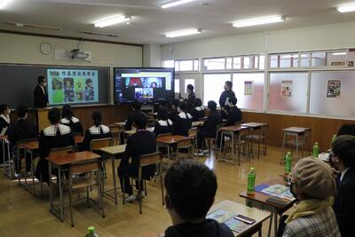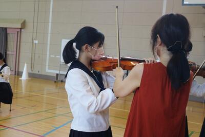 後半は,バイオリンと二胡に直接触れての楽器体験で,孫の手に玄を張った手作り楽器で練習しました。最後は代表の生徒が実際に情熱大陸を演奏しました。とても楽しかったです。 【文責:副校長 小野寺基好】