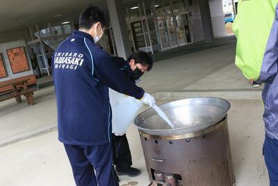 令和4年11月15日(火)に防災訓練が岩沼高等学園川崎キャンパスさんと合同で行われました。今回は避難後の訓練として,川崎校は,コロナウイルス対策を施した炊き出し訓練を行いました。川崎町福祉課と社会福祉協議会からご飯を炊く防災釜と豚汁を作るための防災鍋を借用しました。炊き出し訓練では,ご飯と豚汁を全校生徒60人分と教員分用意するという課題のもと,町職員の指導を受けつつも,教員の力は借りずに,生徒たちだけで挑戦しました。お米33.3合(5キログラム)を炊くための水加減や火起こし,鍋の具材となる野菜を学校の畑から必要分だけ調達することなどを自分たちで考えて行動しました。そして出来上がり後には,配膳という運営までを行いました。
