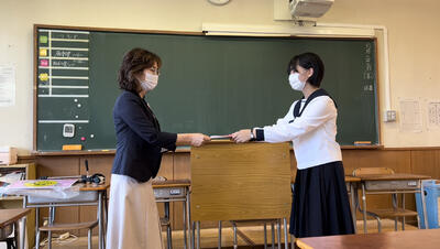 令和5年6月29日(木)に、昨年度に引き続きみやぎ生協様より、本校の教育活動である総合的な探究の時間「カワサキクエスト」の取組にご理解をいただき「みやぎスマイル基金」の助成を受けることになりました。今年度は2年生と1年生が対象です。当日は、みやぎ生協の代表の方から、1年生の生徒代表へ目録の授与式がありました。この授与式では、各学年の生徒代表が活動内容の説明として、2年生は地域の方へのライフストーリーインタビュー、1年生は地域の食にテーマをあてた活動となることを説明しました。今後の活動に期待ができます。