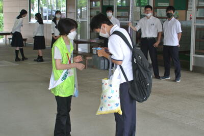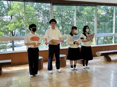 令和5年7月10日(月)3年ぶりに”社会を明るくする運動”として、川崎町推進委員の5名の方が、7時45分から8時35分の間で来校いただきました。そして、この活動にあわせて生徒会の代表があいさつ運動を行いました。運動の趣旨は「それぞれの立場において力を合わせ、犯罪や非行のない安全で安心な地域社会を築こうとする」ということです。