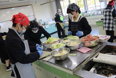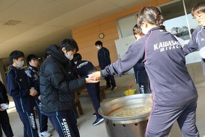令和6年11月14日(木)に防災訓練が岩沼高等学園キャンパスさんと合同で行われました。避難後の訓練として、川崎校は炊き出し訓練を、またキャンパスさんと協働で避難所設営を行いました。川崎町福祉課と社会福祉協議会からご飯を炊く防災釜と豚汁を作るための防災鍋を借用しました。また今回はボランティア友の会から野菜の提供も受けました。炊き出し訓練では、ご飯と豚汁を全校生徒50人分とドリームの郷から避難してきた想定の方々15人分用意するという課題のもと、町職員の指導を受けつつも、教員の力は借りずに、生徒たちだけで挑戦しました。お米33.3合(5キログラム)を炊くための水加減や火起こしをしたり、段ボールでプライベート空間や更衣室、ベッドを組み立てたりと自分たちで考えて行動しました。そして出来上がり後には、配膳という運営までを行いました。川崎町ボランティア友の会の皆様の協力にも感謝します。