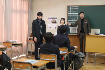 令和6年12月11日(水)に2時間連続で、3年生対象のスーツ着こなしセミナーが、株式会社コナカ様協力の下で開催されました。これから社会人として生活していく上で、就職であれ、進学であれスーツを着る場面が多くなります。例えば入社式や入学式、結婚式など様々な場面が考えられます。そのような場面では、どのような着こなしが一般的なのかを、実際に生徒代表がモデルとなってスーツを着て説明を受けました。モデルの皆さんはピシッと決まってとても素敵でした。