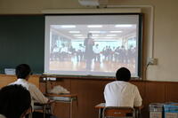 避難訓練の前に、東日本大震災の時の「川崎校」被害状況を収めた画像をもとに、避難する場合の注意点について確認しました。窓枠は飛び、ガラスは散乱し、想像以上の足場の悪さに、避難の難しさを知ることができました。