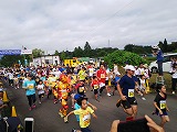 (仮面ラ〇ダー?は、途中で脱皮したのでしょうか?。ハーフマラソン1位の方は1時間16分台はスゴイ!!。チョコえもんも暑さの中頑張っていました。最遠方からの参加者は山口からの方でした。最高齢の方は83歳でした。 皆さんスゴいです!! )