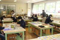 絵の具を吹き付けたりブラシで弾いたり,画用紙に色をのせたときの「偶然の造形」に驚きながら,楽しく授業が進んでいました。