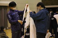 昨年は「避難所設営」で、今年は「三角巾による包帯講習会」の実践。