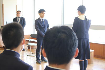 令和6年4月10日(水)に対面式がありました。対面式では、新入生を柴田農林高校川崎校と岩沼高等学園川崎キャンパスの2・3年生が両校の新入生を合同で迎え入れる形で行われました。この対面式の準備や進行を行ってくれたのは生徒会のみなさんです。前半はICT機器を上手に使いながら、生徒会の組織図を説明したり、両校の先生方を紹介したりしました。後半は、男子バスケットボール部、ソフトテニス部、卓球部、陸上競技部、ボランティア部、総合文化部の部活動紹介が実技を交えてありました。昨年同様にそれぞれが趣向を凝らしていてとても楽しいものでした。最後には新入生一人一人が自己紹介を行いました。