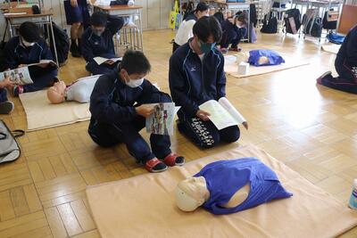 令和4年8月1日(月)に,大河原消防署川崎出張所から職員の方を招いて,3年生を対象とした救急救命講習が行われました。この講習では,訓練用の人形を用いて一人ひとりが救命訓練に挑戦しました。訓練では実際にAEDを使用し,心臓マッサージなどを行いました。きっと緊急時に役立つことと思います。