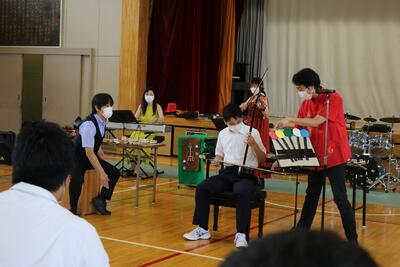 令和4年8月25日(木)に芸術鑑賞会がありました。今年のジャンルは音楽で,生徒たちが鑑賞しているフロアに演奏家の皆さんがいて,ピアノ,バイオリン,二胡,ドラムで演奏を奏でました。曲目は映画音楽のザ・ローズやテレビでおなじみの情熱大陸などでとても迫力がありました。