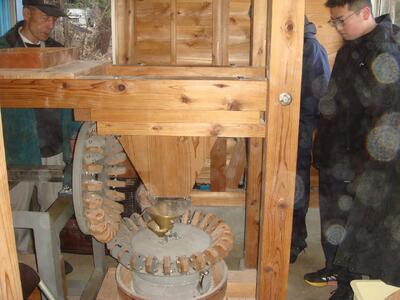 9月上旬に3年生を中心に栽培した「そば」を、11月に収穫しました。収穫したそばの実については、NPO法人「川崎町の資源をいかす会」様のご協力のもと、製粉していただきました。製粉は川崎校近くの水車小屋で行い、水車の回転力で石臼をゆっくり回すことで、玄そばに熱を加えずに挽くことができ、風味豊かなそば粉が完成しました。そば粉は後日、そば打ちをして食します。