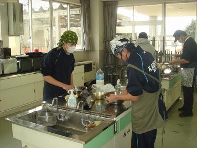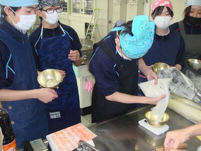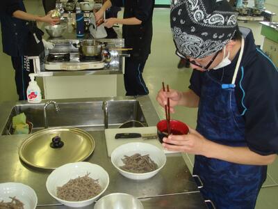 「NPO法人の川崎町の資源をいかす会」様の協力の下、学校で栽培した「そば」と川崎町産「そば」を挽いていただき、早速 そば打ちを行いました。そば打ちの方法については各自が調べ、学習したことを実践(過去にそば打ちをした人:全員)二八そばを打つことを目標に取り組みました。水回し、延し、切り・・・それぞれ特徴的なそば打ちとなりましたが、そばの風味がとてもよく、全員完食しました。