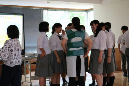 講話の後に、8kgの重りを身につけての妊婦さん体験をしました。
