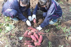土の中に隠れている、初めて出会う「サツマイモ」を手探りで探しながらの収穫に、生徒も楽しそうに取り組んでいました。