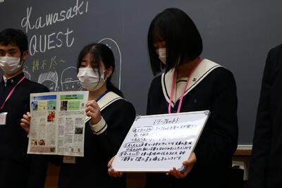 令和6年2月1日(木)に、川崎町町長を始めとし、お世話になった方々をお招きして、2・1年生の総合的な探究の時間で取り組んでいる、カワサキクエストseason3「町内で魅力的な取組をしている方々のインタビュー動画」(2年生)、「特産のそば粉を使った新しいメニュー開発【ガレット】」(1年生)の成果発表会が行われました。この発表会に至るまでの道のりは大変で、放課後も各グループが編集会議や作業を行いました。その成果は素晴らしく、来校いただいたお客様に感動を与えるものでした。 【文責:副校長 小野寺基好】