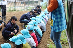 かわさきこども園さんで、選択科目『生物活用』の生徒たちが毎年恒例のさつまいもの苗植えを行いました! また、11月頃一緒に収穫をする予定です。