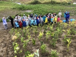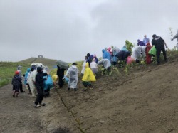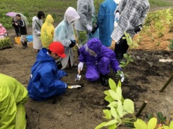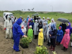 「科学と人間生活」の授業として、川崎第二小学校の児童と合同で千年希望の丘への植樹活動を実施しました。この活動は平成25年度から川崎町で実施している志18年教育「学びの架け橋レインボープラン」の一環として、小学校と連携して行われるものです。また、植樹は公益財団法人鎮守の森のプロジェクトの指導の下で行われました。