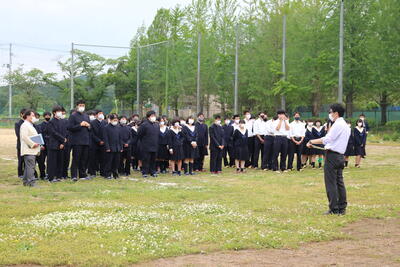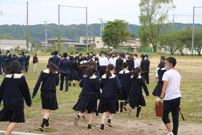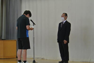 高体連仙南総体へ出場する運動部(卓球部、ソフトテニス部、陸上部)への壮行式が県総体出場も見据え4月28日(水)6校時に体育館で行われました。開会宣言の後、松岡生徒会長の挨拶に続き各運動部部長から大会への抱負が語られ、応援団(生徒会)が熱いエールを切り皆で応援しました。選手を代表してソフトテニス部の菅原部長から選手宣誓があり、最後に下田副校長から激励の言葉がありました。生徒会長からは「選手全員、特に3年生にとっては最後になるので、悔いの残らないように全力を出し切り一つでも上に勝ち進むように期待する」旨の話がありました。副校長からは、校舎入り口に掲げられている『疾風(しっぷう)に勁草(けいそう)を知る』(=激しい風が吹いて初めて強い草が見分けられることから、困難に遭ってはじめてその人間の本当の価値、本当の強さがわかるということ)の言葉を通しながら「今しかできない事もある。今こそできる事もある。大会後の人生に繋がるような戦いを」との激励がありました。選手の皆さん、頑張ってください!!【文責:副校長 下田 仁】