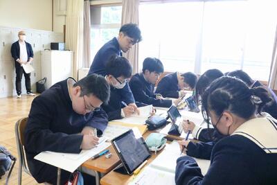 本校の授業は対話的な展開が多いため、中学校とは違う授業内容に関心を寄せながら参観されている様子でした。