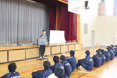 前半はICT機器を上手に使いながら、生徒会の組織や学校行事などの説明をしました。後半は、男子バスケットボール部、ソフトテニス部、卓球部、陸上競技部、ボランティア部、総合文化部による部活動紹介があり、実技を交えたプレゼンテーションが行われました。