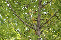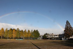 (写真:夏のクヌギの様子。 11月12日早朝、虹が校舎を覆っていました。)