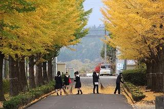 今朝は一段と冷え込みました。登校すると、校門からのイチョウの並木路は、落ち葉で埋め尽くされていました。