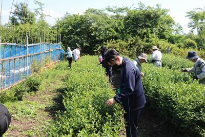 令和5年8月6日(日)にNPO法人 川崎町・学校サポートネットワークさんの協力を得て、1年生のボランティア部6人が、川崎町の茶畑復活プロジェクト・茶摘み体験に参加しました。初めての茶畑、茶摘み、その後に摘んだ茶葉を試飲するまでを経験することができました。貴重な体験でした。普段飲んだことのない深みのあるお茶の味わいでした。工程は、茶摘み・茶葉選別・30秒蒸し・手もみ焙煎・試飲という感じです。