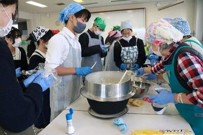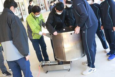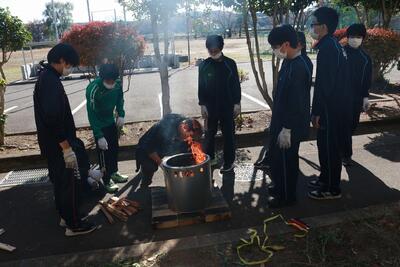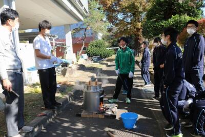 令和5年11月16日(木)に防災訓練が岩沼高等学園キャンパスさんと合同で行われました。今回は避難後の訓練として、川崎校は炊き出し訓練を、またキャンパスさんと協働で避難所設営を行いました。川崎町福祉課と社会福祉協議会からご飯を炊く防災釜と豚汁を作るための防災鍋を借用しました。炊き出し訓練では、ご飯と豚汁を全校生徒64人分とドリームの郷から避難してきた想定の方々20人分用意するという課題のもと、町職員の指導を受けつつも、教員の力は借りずに、生徒たちだけで挑戦しました。お米33.3合(5キログラム)を炊くための水加減や火起こしをしたり、段ボールでプライベート空間や更衣室、ベッドを組み立てたりと自分たちで考えて行動しました。そして出来上がり後には、配膳という運営までを行いました。川崎町ボランティア友の会の皆様の協力にも感謝します。