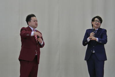令和6年9月30日(月)に芸術鑑賞会がありました。今年度は3年に一度の大芸術鑑賞会でした。ジャンルは主として古典芸能で、チャッパと舞踊・和太鼓と三味線の鼓風☆響さん、漫才のニードルさん、そして東北弁落語の六華亭遊花師匠の芸を鑑賞しました。体験コーナーでは、師匠に落語におけるそばのすすり方を教わり、鼓風☆響さんには太鼓のバチさばきと心得を習いました。笑いの絶えない大盛り上がりの芸術鑑賞会でした。