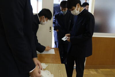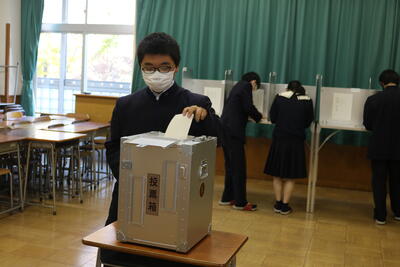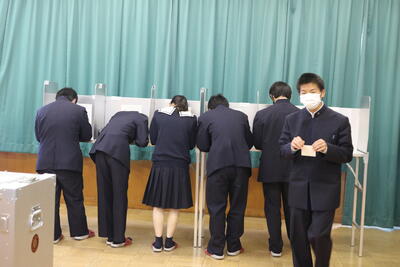 11月11日(木)6・7校時、体育館で生徒会立会演説会が行われ、その後、校舎2階の多目的室で投票が行われました。投票にあたっては、川崎町総務課・選挙管理委員会事務局様のご協力をいただき、本物の投票箱と投票記載台をお借りして行われました。18歳以上の生徒が投票権を有する時代に、その意識を高めるためにも実物を使用させていただくことができて有意義でした。ありがとうございました。【文責:副校長 下田 仁】