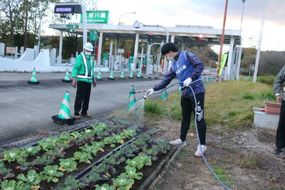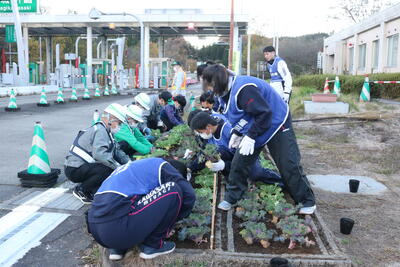川崎IC入口に向かって右側にある花壇に、NEXCO東日本の方々に用意していただいた葉牡丹を交互に植えていきました。葉牡丹はキャベツのように見えますが葉が色づくため、花の少ない冬期に花壇を彩ってくれる冬のガーデニングに欠かせない存在です。また、祝福・利益・慈愛などの花言葉をもつ縁起のよい植物として、お正月の寄せ植えに昔から利用されてきたようです。