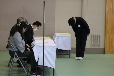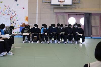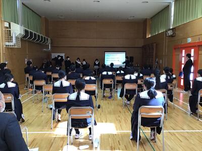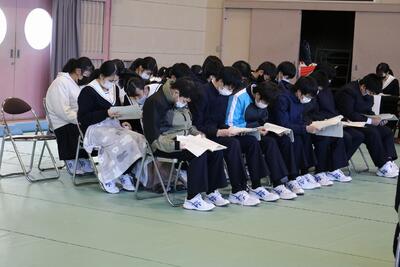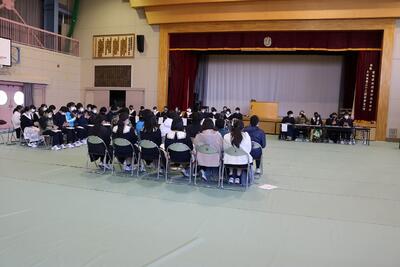 体育館ステージ側には生徒会役員、委員会委員長、部活動部長などの代表生徒が座し、各学年の生徒が取り囲むようにしている。 前期活動報告等に加え、生徒会会長選挙開票結果報告、新生徒会役員人事、クラスからの提案・要望事項などが出された。皆、関係資料を見ながら説明等に真剣に耳を傾けていた。最後に、前生徒会長から新生徒会長にバトンタッチされ、旧役員全員からの一言のあと、新役員全員からの抱負が披瀝された。新生徒会役員には、旧役員の取組成果を受け継ぎ、更なる飛躍を目指して頑張っていただきたい。【文責:副校長 下田 仁】