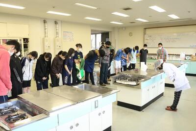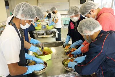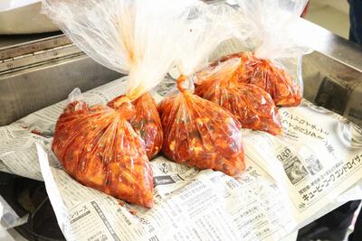 12月15日(水)3、4時間目、韓国キムチ販売店の相原和加子さんを講師にお招きして、フードデザインの授業時間に家庭科室でキムチづくり教室を開催した。実は、支援学校岩沼高等学園川崎キャンパスで先に行われた同教室を参考に川崎キャンパスの先生方のご協力の下に実現した。川崎キャンパスで収穫された白菜30個、川崎校で収穫された大根30本を事前に相原さんのお店にお持ちし、予め下準備をしていただいた状態から行われた。