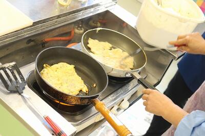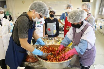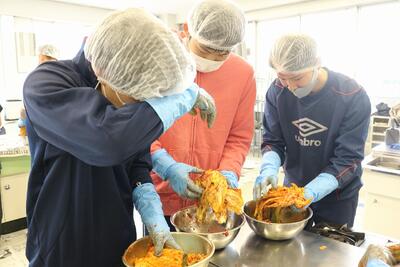 講師を紹介させていただいた後、自校(川崎キャンパス、川崎校)で育てた野菜を利用してキムチづくりの紹介、キムチづくり体験、チヂミづくり体験、試食の順で進んでいった。隠し味として、熟した柿、干し柿、リンゴ、梨、バナナなどが使われていたのが驚きだった。最初はキムチ作りに疑心暗鬼だった生徒も、最後には、キムチの美味しさに、皆こころが一つに溶け合った。【文責:副校長 下田 仁】