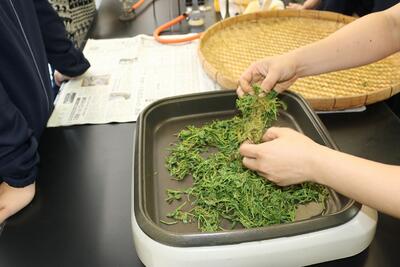 令和5年8月6日(日)にNPO法人 川崎町・学校サポートネットワークさんの協力を得て、1年生のボランティア部6人が、川崎町の茶畑復活プロジェクト・茶摘み体験に参加しました。初めての茶畑、茶摘み、その後に摘んだ茶葉を試飲するまでを経験することができました。貴重な体験でした。普段飲んだことのない深みのあるお茶の味わいでした。工程は、茶摘み・茶葉選別・30秒蒸し・手もみ焙煎・試飲という感じです。