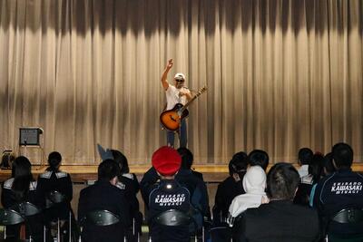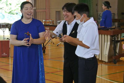 令和5年8月30日(水)に芸術鑑賞会がありました。ジャンルは昨年に引き続き音楽で、生徒たちが鑑賞しているフロアに演奏家の皆さんがいて、鉄琴、木琴、ドラムなどの打楽器演奏が披露されました。