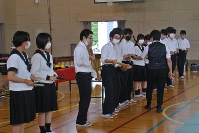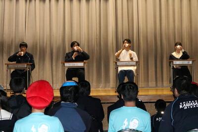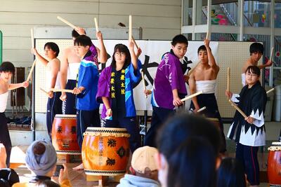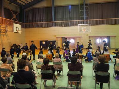 令和5年10月26日(木)に川高祭(文化祭)で披露した和太鼓演奏とよさこい演舞を、学校裏のディサービスから、おじいちゃん、おばあちゃん達を招待し、学校の体育館で再演しました。昨年はコロナウイルス感染予防対策で外での披露でした。披露にあたりディサービスのみなさんから暖かい拍手をいただきました。とても喜んでいただけたと思います。