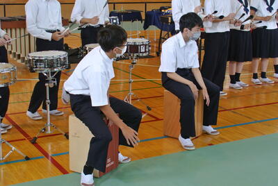 後半は、牛や蛙の声、鳥のさえずりを再現する楽器やスネアドラムなどに直接触れての楽器体験で、学年ごとに練習しました。最後は学年ごとにラテンの曲を合奏してとても楽しかったです。